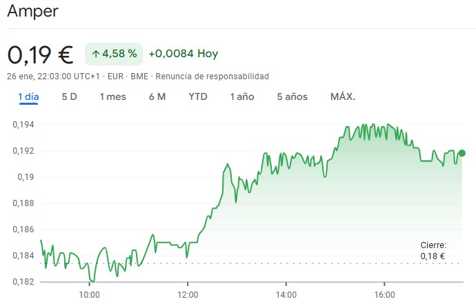 Amper ha vuelto a ser protagonista ahora para los pequeños inversores. La empresa ha cerrado este lunes con una revalorización del 4,58% y la cotización está en 0,19 euros, una cota que se le resistía en las últimas semanas del mercado.