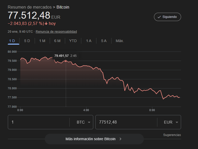 Bitcoin ha arrancado la jornada con una bajada clara y sostenida. Según el gráfico, la criptomoneda se mueve en torno a los 77.512 €, con una caída diaria de -2.043 € (-2,57%), tras varias horas de a la baja y un tramo final con más presión vendedora.